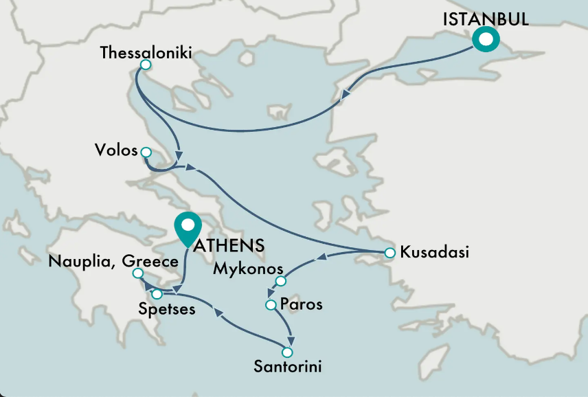 Ports: Thessaloniki, Volos, Kusadasi, Mykonos, Paros, Santorini, Spetsai, Nafplion