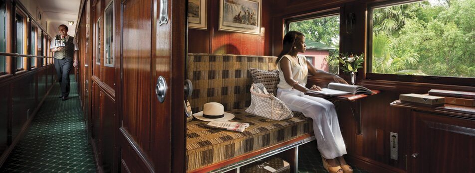 Rovos Rail operates four trains of these superbly restored and converted coaches, which accommodate up to 72 passengers in style and comfort. Each train has a lounge car, a unique glass-ended, open-balcony observation car, a smoking club lounge and one or two dining cars – either a 1920s period piece with romantic teak pillars or a more modern 1930s example with large, traditional windows offering guests a panoramic view of the passing landscape. A remarkable achievement in 2013 was the construction of three pillared dining cars using the shells of steel second-class sleepers.